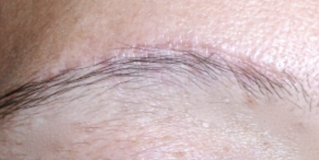 傷跡は消すことはできません。目立ちにくくすることはできますが、キズがなかったときのような肌にはもどれません。そこを眉上にしても眉下にしても覚悟してうけてくださいね。この写真で綺麗なほうです。きれいでもこれくらいです。これくらいなら、これよりちょっと目立っても構わないくらいで受けてくださいね。わたしはおすすめしません。