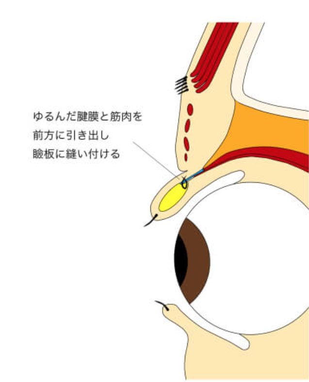 瞼をあげる筋肉には眼瞼挙筋とミュラー筋という筋肉があります。これらの筋肉を短くする、またはたくし上げることで瞼を上げやすくします。トラブルとしては、あげやすくなった分、閉じるときにつっぱりが出たり、寝てる時に目が開いていると指摘されたりということは普通に生じます。つっぱりが強い、目が閉じれないとなると、目が乾き、眼球に障害が出ることがあります。眼球に障害が出る前に、涙がぼろぼろ出る、痛くて辛いということが起こりますので、そういった症状がある方は早急に診察を受けてください。